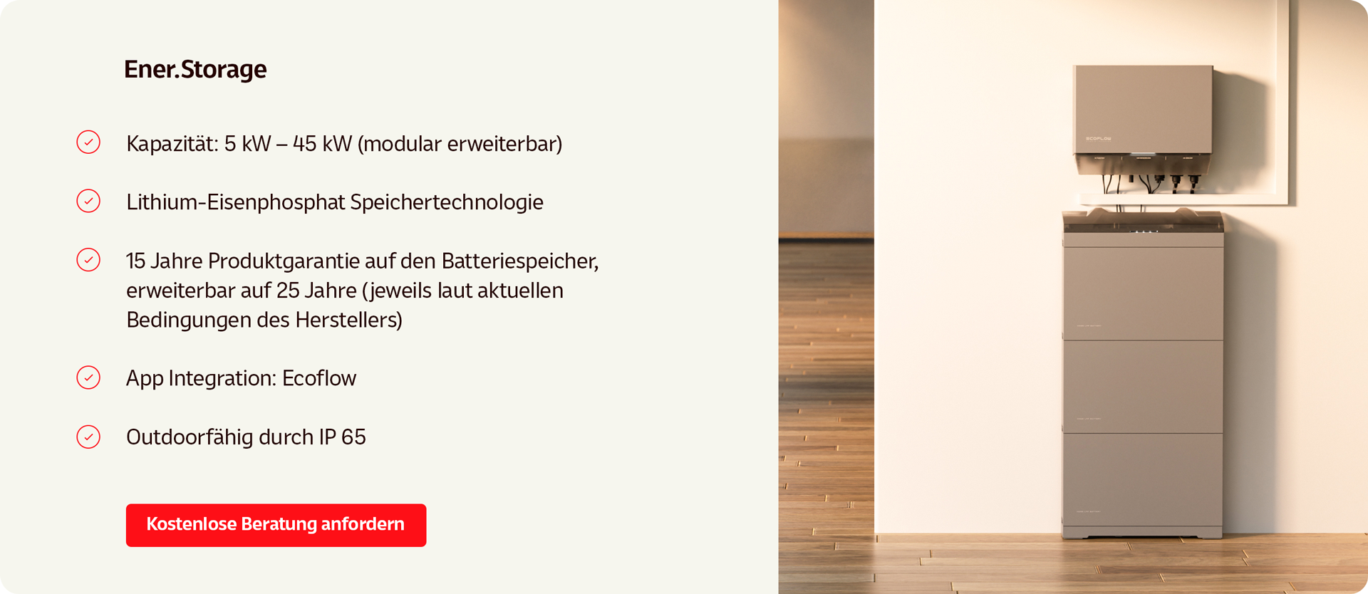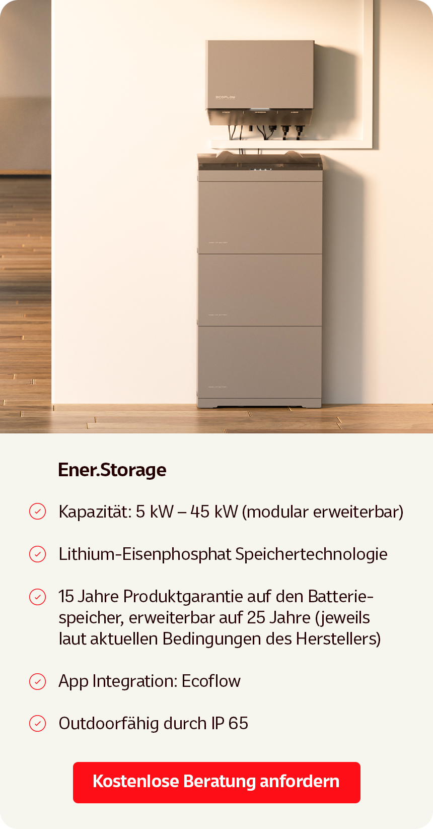 Das System basiert auf langlebiger Lithium-Eisenphosphat-Technologie und ist optimal auf den Alltag unserer Kunden abgestimmt. Eine Garantieverlängerung beim Hersteller ist kundenseitig möglich.