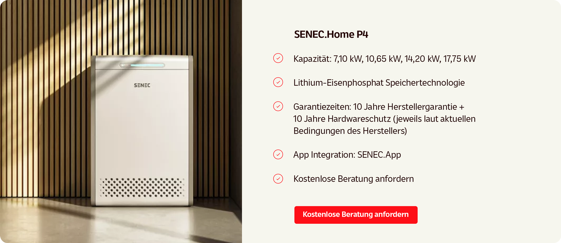 • SENEC.Home P4, in den Größen 7,1 bis 17,75 kWh, mit 10 Jahren Garantie plus 10 Jahren Hardwareschutz und der bekannten SENEC.App.