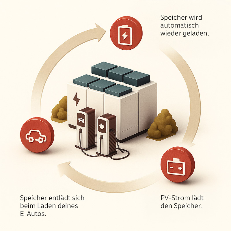 Sobald der Strombedarf im Haus steigt – zum Beispiel am Abend oder beim Laden eines E-Autos – stellt der Speicher die zuvor gespeicherte Energie wieder zur Verfügung. So kann Solarstrom auch dann genutzt werden, wenn die Sonne gerade nicht scheint.